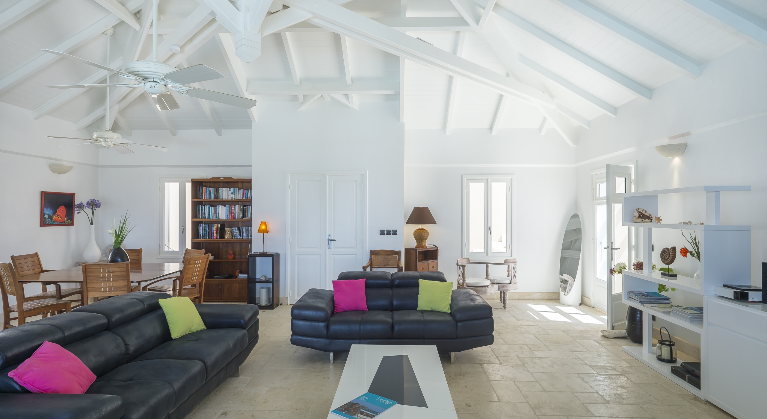 The large living opens onto the terrace, the long pool and the sea.